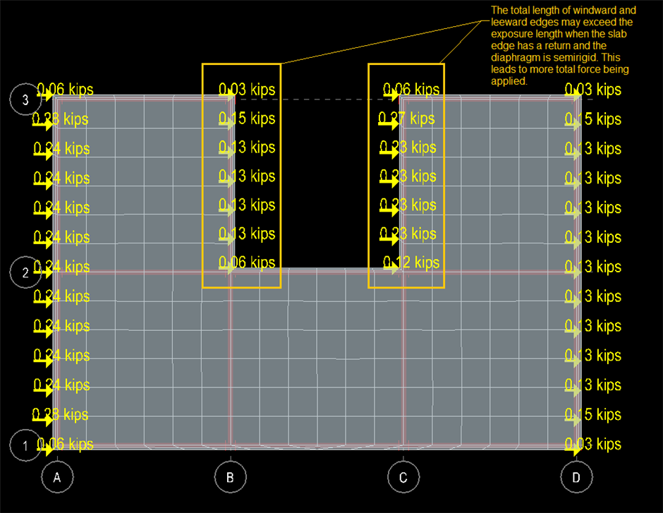 The total length of windward and leeward edges may exceed the exposure length when the slab edge has a return (like a "U" shaped structure) and the diaphragm is semirigid. This leads to more total force being applied (when using program generated wind loads) since all these edges are loaded based on the pressure, story height and mesh size.
