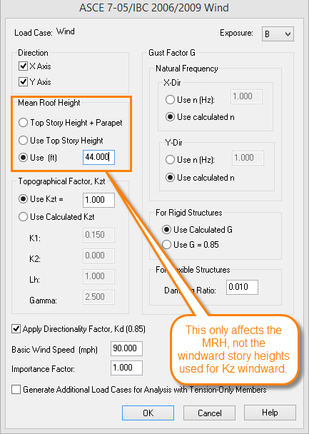 Note, in the wind load definition there is a property for Mean Roof Height which is taken as the top story height be default. The user can override this value which will alter the pressure, but when calculating the windward pressure, the original story heights above ground are still used. In other words, the program is not adjusting Kz windward based on the input mean roof height.