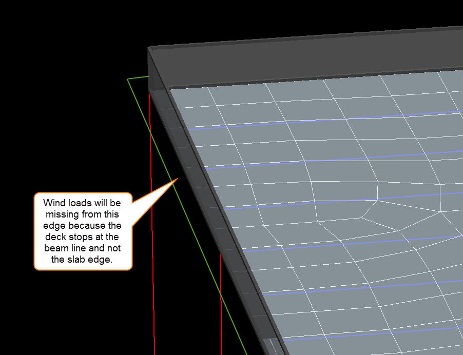 Furthermore, when wind loads are applied to a meshed semi-rigid diaphragm only the windward and leeward edge nodes are loaded. if the applied deck does not extend to the slab edge overhang, then the program will fail to find the edges to load and the total applied load will then be less than it should be. It's imperative that the deck extend to the slab edge when using semi rigid diaphragms.