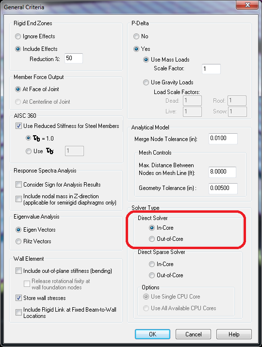 Problem: Analysis time with the In-Core Direct Solver (selected in RAM Frame - Criteria - General, see figure below) is significantly slower in v14.06 than in earlier versions.