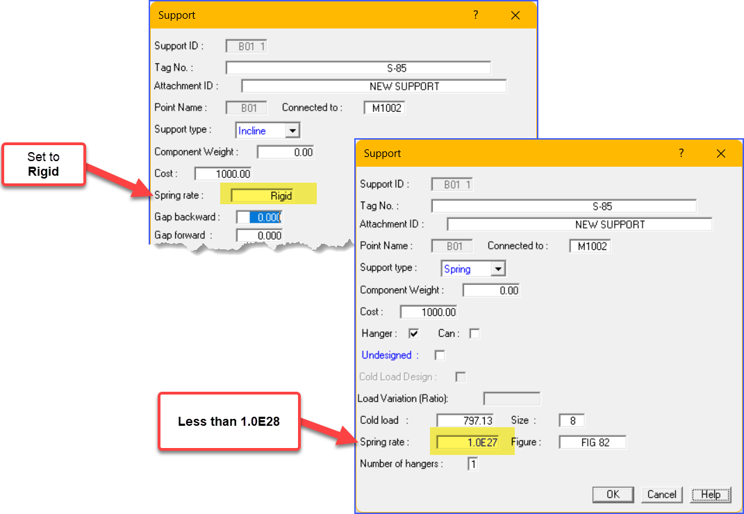 b. If Spring Stiffness is set to 1.0E28 or greater, change stiffness/spring rate value below 1.0E28. or are set to RIGID.