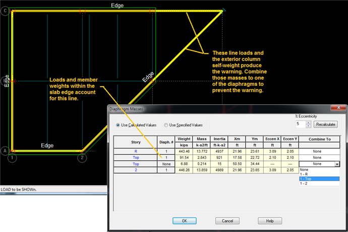 Under Loads - Masses you can evaluate the total diaphragm masses and you can combine these values with some diaphragm, override with User Specified Values or choose to ignore them by doing nothing.