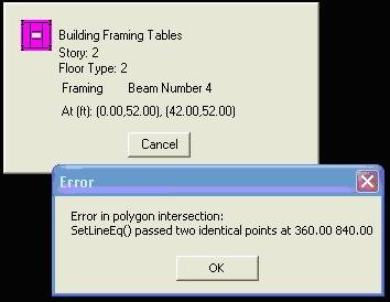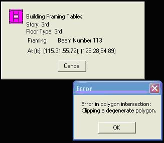 When any design module is initiated, the program starts by “Building the Framing Tables”. During the process, the program goes through the beam loops one at a time to determine the tributary loads. If a polygon error occurs while the framing tables are being built, the user can identify the beam number and coordinates together with the floor type where the program stopped processing information. This information can be helpful in locating the source of the error.