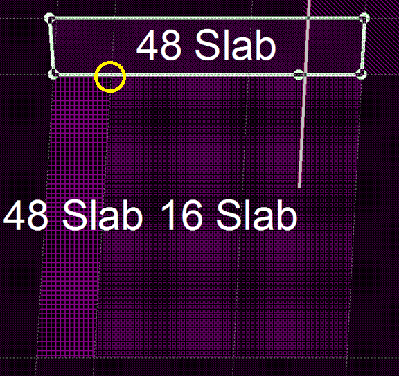 In the example below, the "48 Slab" and "16 Slab" deck areas snap to a deck vertex at the point marked in the screen capture. However, the top "48 Slab" area does not have a vertex at this point. Because the 3 nodes at the bottom edge of this polygon have slightly different y-coordinates, there is a slight skew and small overlapping zone near this area. Adding a deck vertex in the polygon representing the top "48 Slab" area at the point marked in the screen capture resolves the problem.