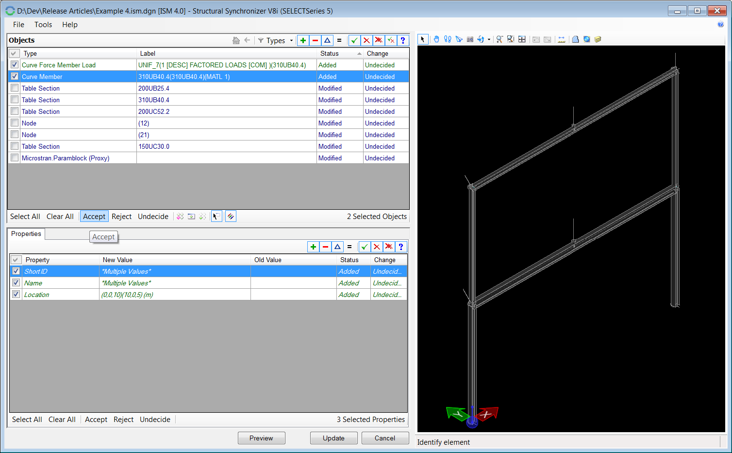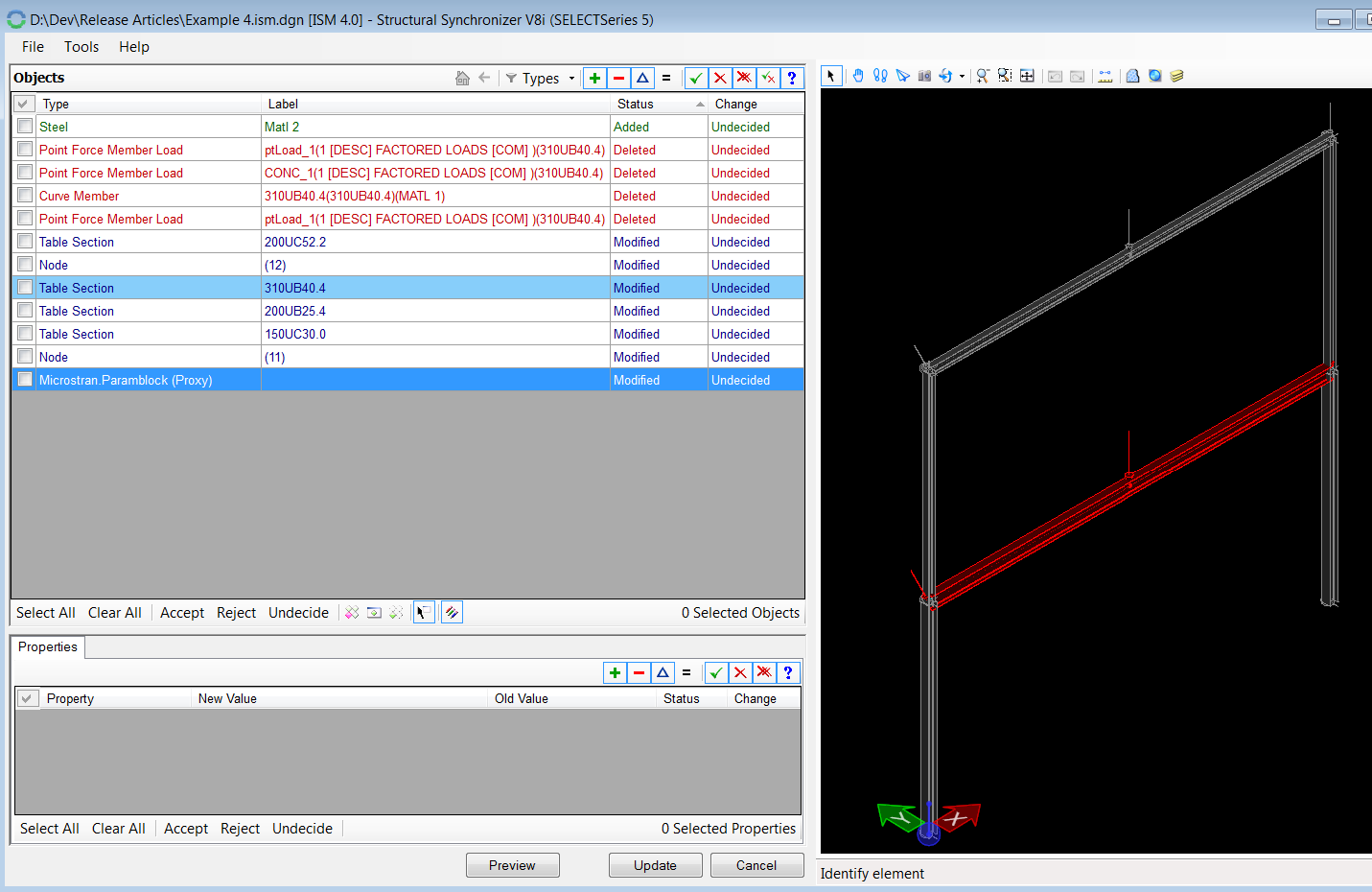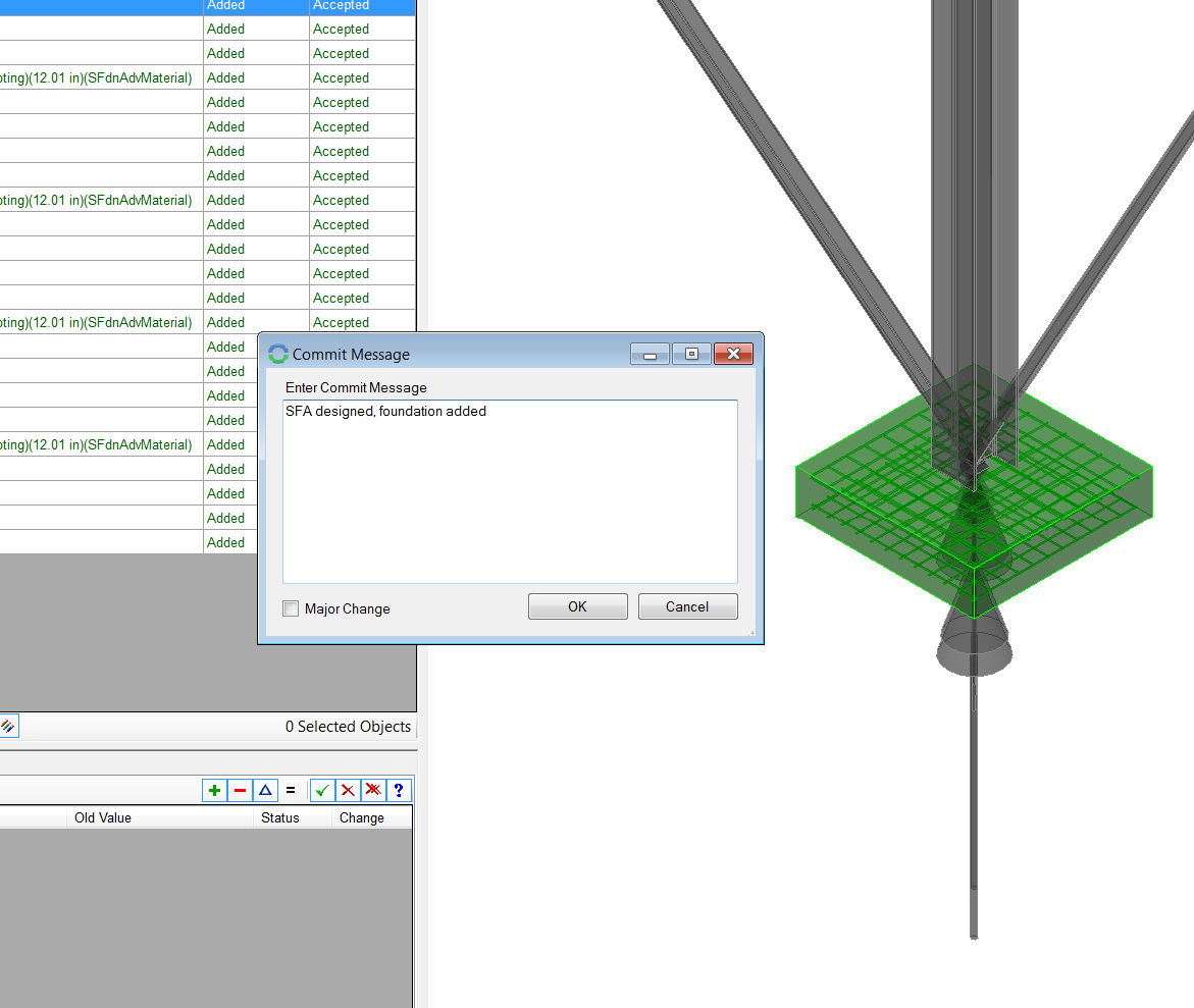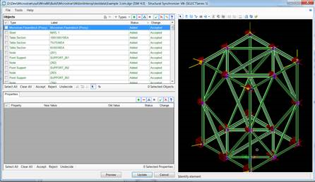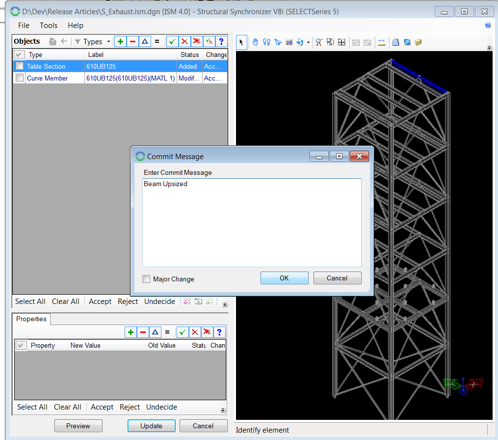 3. Upsize one of the beams in Microstran, and Update the ISM Repository. Within Structural Synchronizer, accept the items being modified and Update. When Prompted, add the commit message: “Beam upsized”