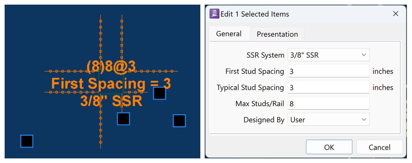 Program SSR can now be changed to User SSR. After conversion to User SSR, the following properties can be modified by the user: SSR System, First Stud Spacing, Typical Stud Spacing, Max Studs/Rail.