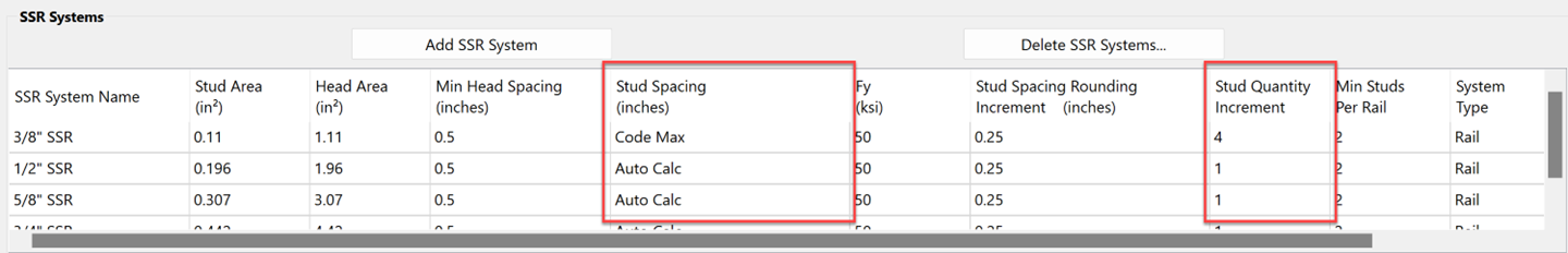 When the Code Max option is selected, RAM Concept fixes the stud spacing to the maximum spacing permitted by the selected design code and adds additional rails during SSR design to achieve the required strength. This option forces RAM Concept to minimize the number of different Program SSR designs across the floor.