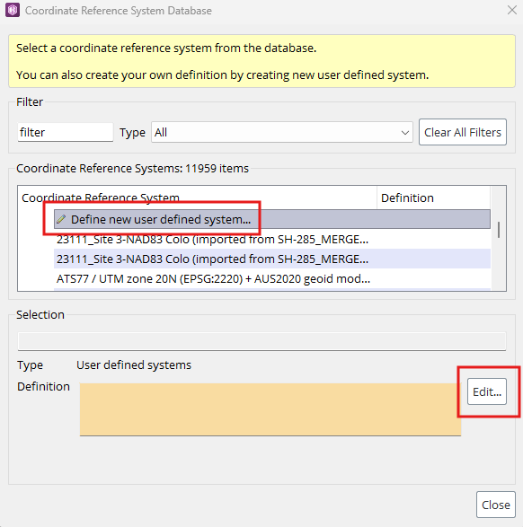 · Click on Edit to define the new coordinate reference system.