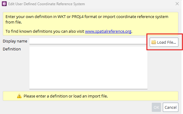 · Alternatively, you can import the definition from a WKT, PRJ or DGN file using the load file button.