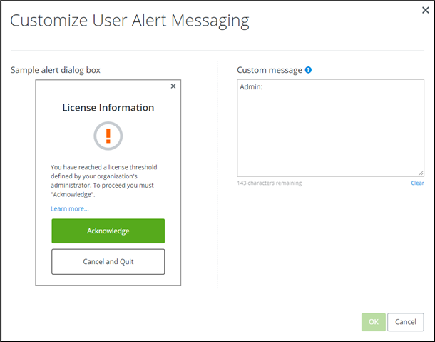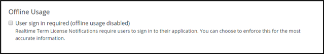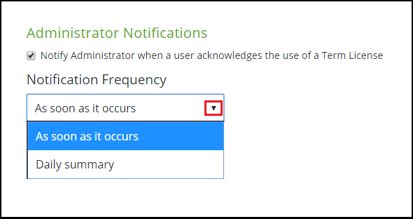 Please Note: License Alerting applies to the Term Licensing pop-up alert displayed to users while Notifications apply to the messaging sent to Administrators and Co-Administrators.