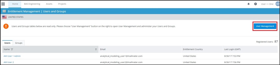 Users and Groups sayfaları, Bentley uygulama kullanıcılarınızın listesini gösterir. Bunlar, CONNECTION Center Kurumsal Portalındaki ''User Managementi' butonuyla e erişilen Kullanıcı Yönetimi ara yüzü ile yönetilebilir. Kullanıcı adları tıklanarak belirli kullanıcılar için yetkilendirmeler eklenebilir veya kaldırılabilir. Bu, “Select the Group Name…(Grup Adını Seç)” ibaresinin yazdığı yerde “User Name (Kullanıcı Adı)” ekleyerek, gerçekleştirilebilir.