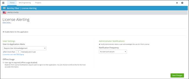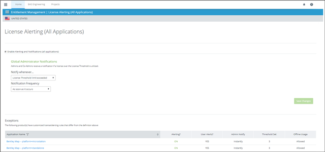 3. adımda yukarıda belirtilen talimatlar, bir yöneticinin belirli bir uygulamaya dair bildirim kurallarına izin verir. Tüm Bentley uygulamalarınıza aynı bildirim kurallarını etkinleştirmek için 'Lisans Uyarısı (Tüm Uygulamalar)' seçeneğini kullanın.