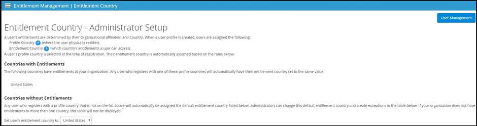 A user's profile country is selected at the time of registration. Their entitlement country is automatically assigned based on the rules below.