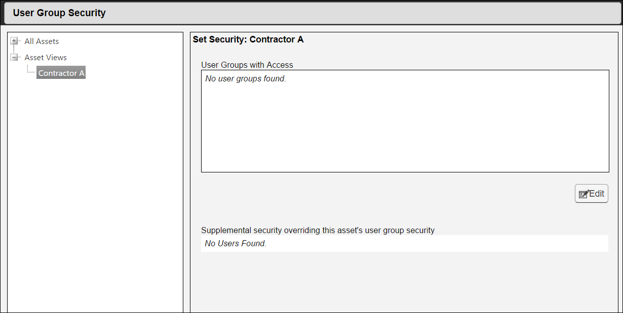 Once an asset view is created and assets are added, the administrator must determine who can access the asset view through user group and supplemental security. These security settings can be established in the Administration module using the Asset Security > User Group Security and Asset Security > Supplemental Security pages.
