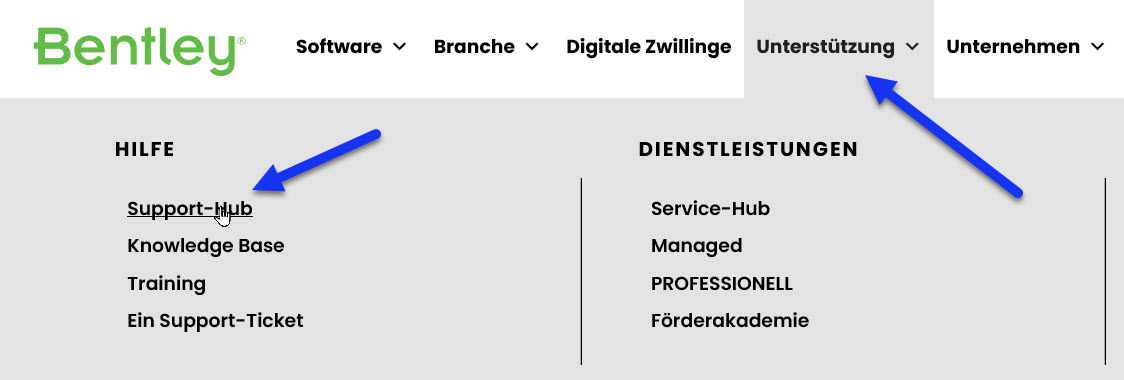 - www.bentley.com starten und im Menü oben auf Unterstützung gehen.