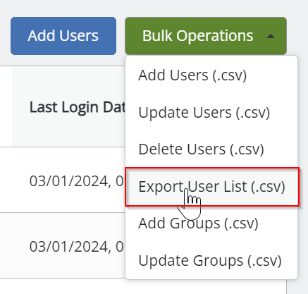 After you've decided if you'd like to remove the filter, you can click on the green Bulk Operations button on the top right hand side of your User Management and select the Export User List (.csv) option: