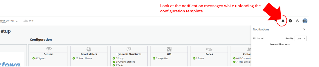 - When the import of the configuration file fails, there is an explicit error provided to the user explaining the reason why it failed. This error should get listed under the notification bell located on the top right corner of the WaterSight application