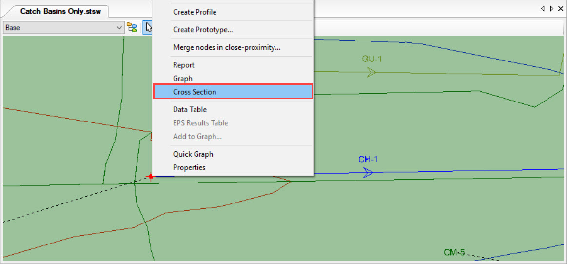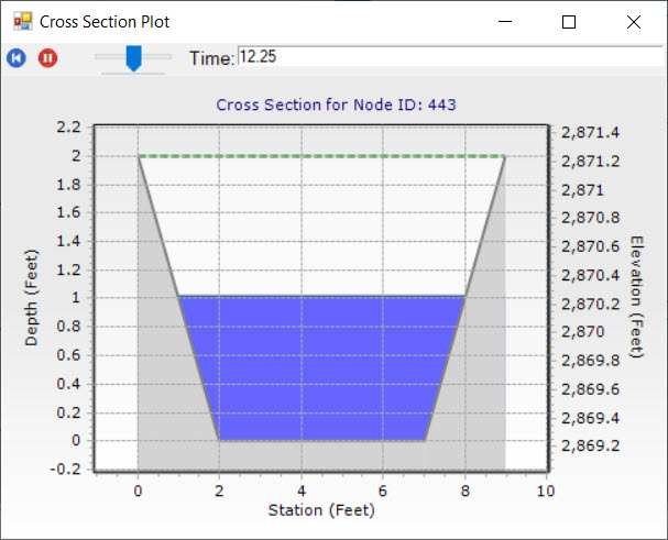 Similar to the Gutter Cross Section Tool, you can also visualize results at cross section elements. When an existing terrain is attached to the model, the cross section results can simply be viewed by right clicking a cross section element and selecting "Cross Section". This would bring up the sectional view of the channel as specified in the cross section properties with water level marked.