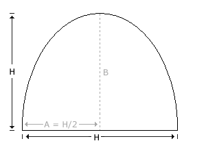 The required input to define the size of a Semi-Elliptical Arch is simply its Height or Rise (H). Unique to this arch shape is the characteristic that at its widest dimension, at its base, the width is equal to its Rise (H). The shape is geometrically defined with the function of an ellipsis, where the traditional elliptical coefficients of A and B respectively correspond to H/2 and H.