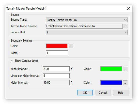 Click on the new button to import a terrain model. The dialogue box below will appear to select the terrain model source. Note that there is a boundary line color, also, as a boundary is drawn around the terrain model area.