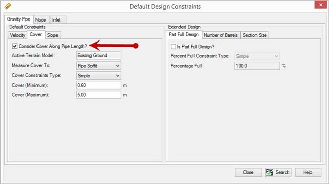 Starting with V8i SELECTseries 5 of the Storm and Sewer products, if you have an active Terrain Model, ground elevations from that model may be used during a Design run to consider cover along the pipe's length. If you want to use this option check "Consider Cover Along Pipe Length?" as shown below.