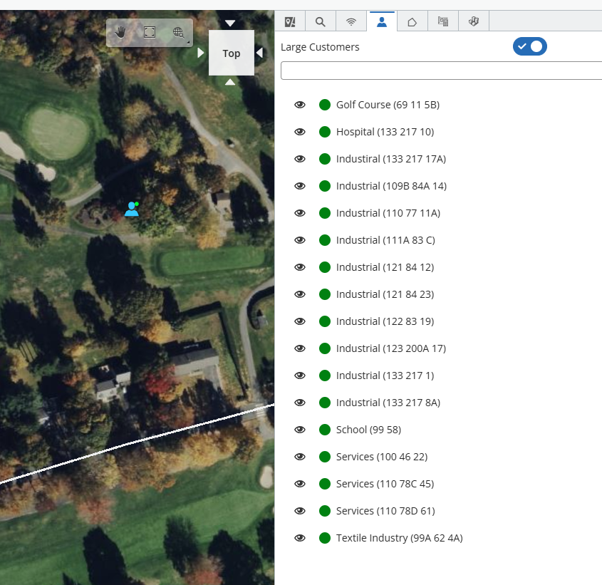 Large customers information can be found and controlled under the Large Customers tab, located in the side panel. To turn on/off the large customers on the map, please click in the visibility icon located on the top. By default, large customers will be turned off. Large customers are configured in the smart meter configuration page. Large customers will be displayed in the map with a customer icon.