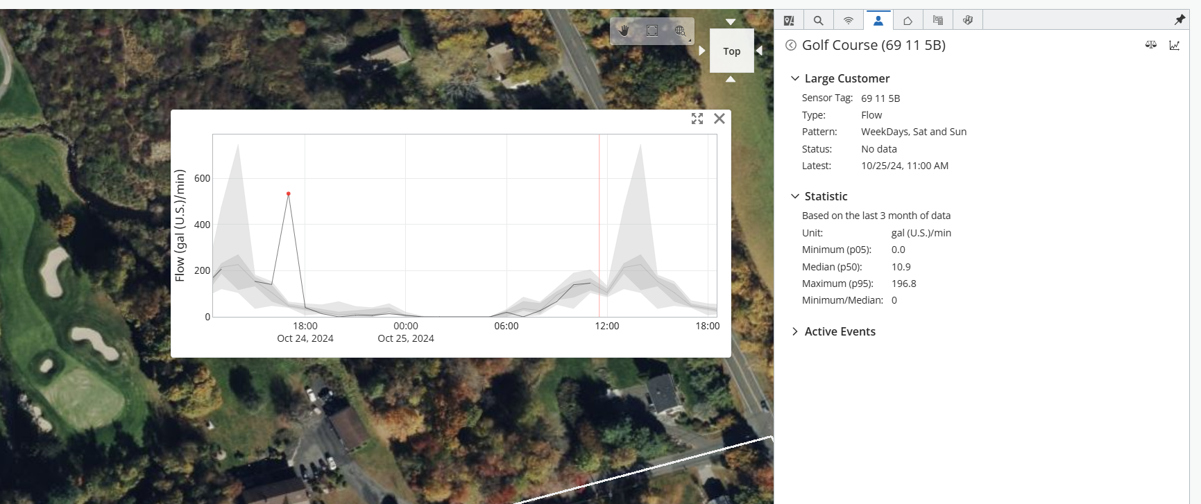 When clicking in a Large Customer icon from the map or from the side panel, a chart with sensor reading for the previous 24 hours is shown together with more information on the side menu.