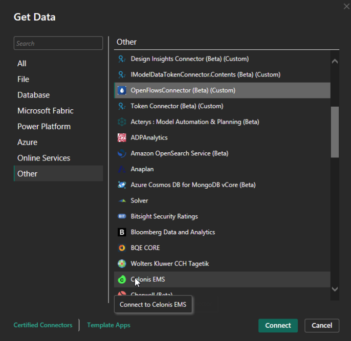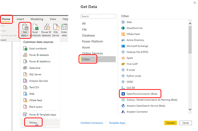 Make sure under the Get Data dialog, Other > OpenFlowsConnector (Beta) is visible