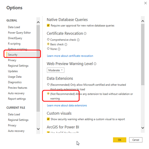 The Power BI desktop, by default, does not allow loading custom connectors. Follow the steps below to enable loading custom connectors.