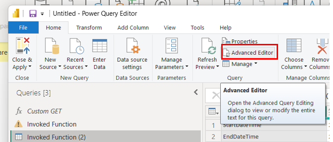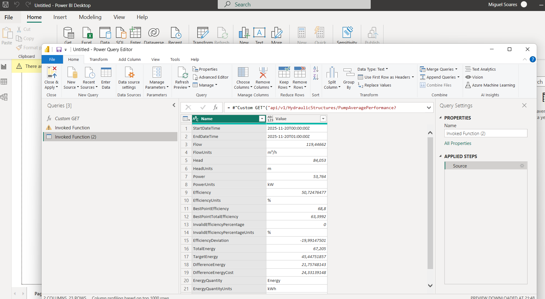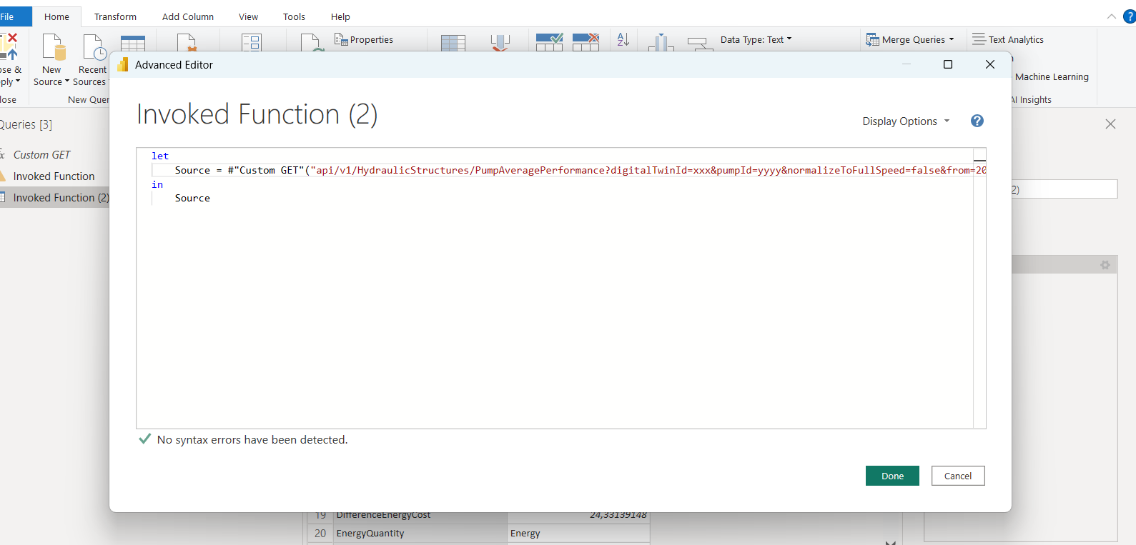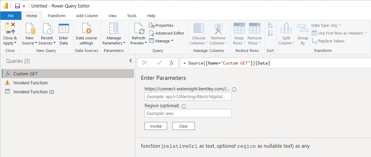 The article below contains another detailed example on how to use the Custom Get function to pull GIS data from WaterSight into PowerBI: