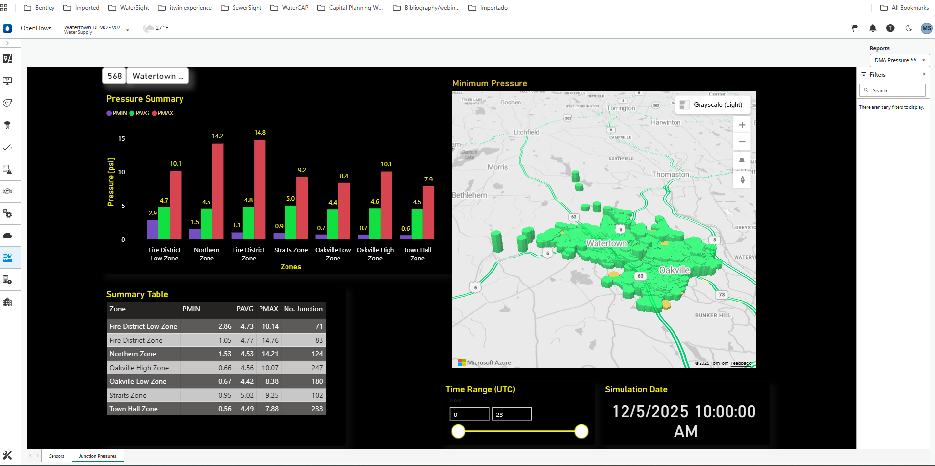 With PowerBI the user can built its own Indicators (KPI) and its own visuals that include any types of charts (pie-charts, bar charts, etc), graphs and map visualizations. In figure below you can see some examples of reports built based on data that exists in WaterSight and using PowerBI.