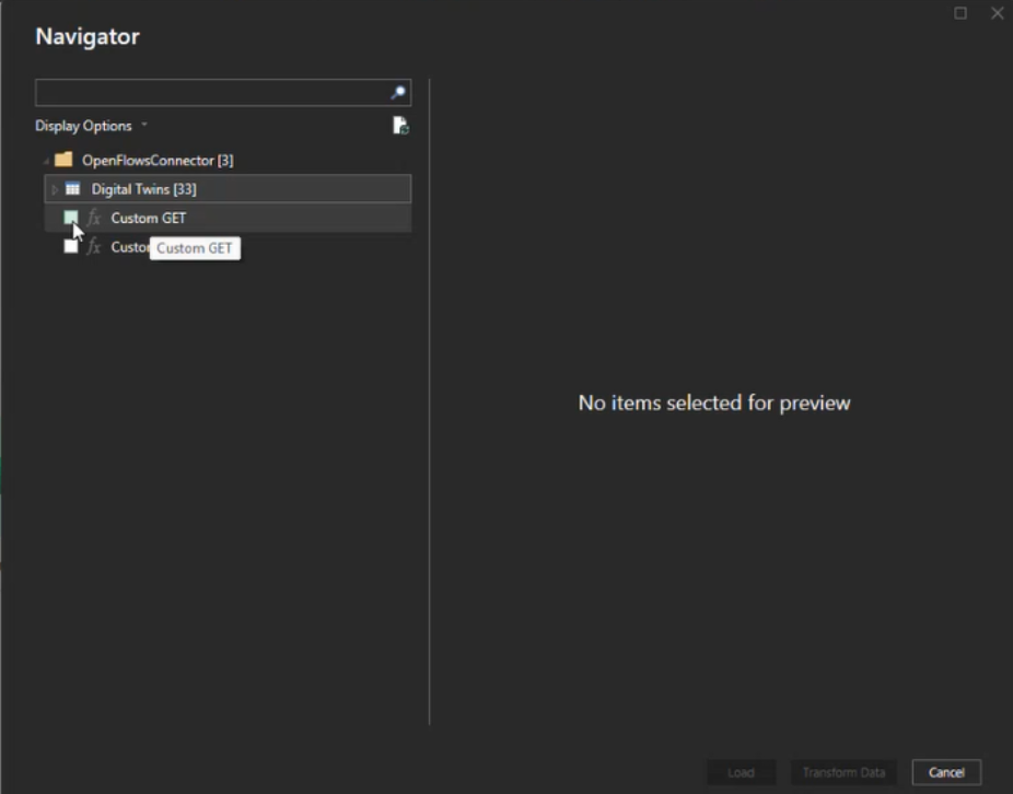 After clicking Connect on the Get Data dialog, a Navigator dialog is loaded.