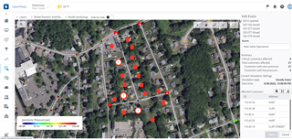 Map automatically zoomed to the location of the event, highlighting all customers affected by the valve operation event, and with the identification of the valves that were opened or closed. Customers and valves are represented with the following colours: