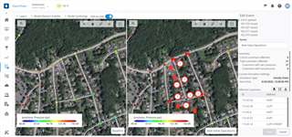 Side by side view will only be available for operational events that were created in the last 7 days. If side-by-side view option is on, it will be possible to easily compare the baseline scenario (with no event) with the event scenario. User can click in any element in the map to see the results for a specific element and compare pre and post event conditions. Graph result will only be available if the event simulation run is Extended Period type, please see below for more information.