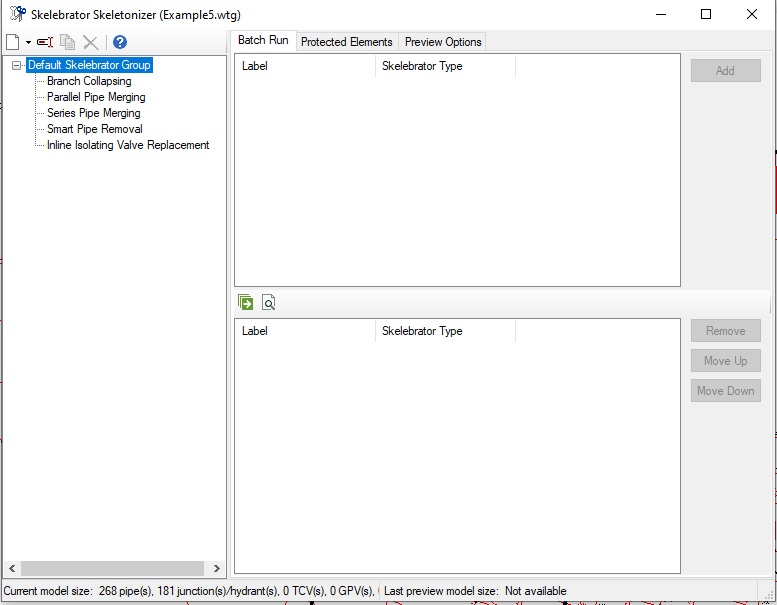 There are few Skelebrator options: Branch Collapsing, Parallel Pipe Merging, Series Pipe Merging, Smart Pipe Removal, and Inline Isolating Valve Replacement. Information on each of these can be found below.