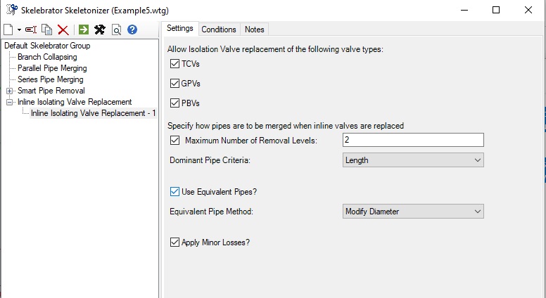 The Apply Minor Losses field is used if you want the minor losses to be retained during the skelebration process. There is also an option to remove TCVs if they are in series.