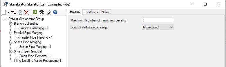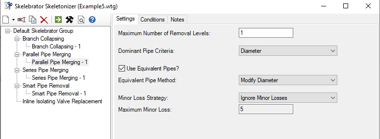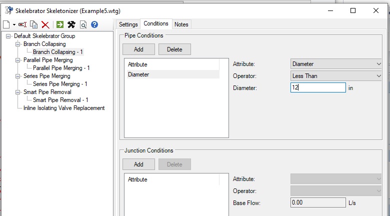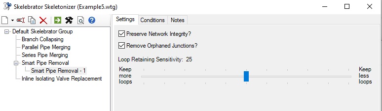 There is an option to include pipe conditions in the Conditions tab for Smart Pipe Removal. Using pipe conditions is highly recommended when using this skelebration method. Smart Pipe Removal is largely used to remove small diameter pipes while retaining network connectivity. By including a pipe condition based on diameter, this will assure that larger diameter pipes are not inadvertently removed from the model.
