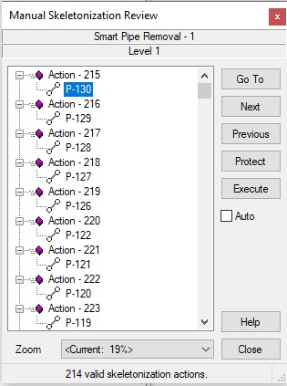 Smart Pipe Removal is a data scrubbing technique that allows the user to remove small diameter pipes (including those that form parts of loops) while retaining network connectivity and important elements, like pumps and valves. The algorithm used marks elements that can be safely removed without causing this issue.