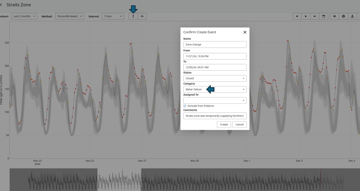 Events can be automatically generated by the solution based on alert triggers defined by the user in the alerts administration (Admin >> Alerts). By default the alerts types configured as No Data or Flat Reading will automatically generate events that will have the option "Exclude From Patterns" enabled (this means that meter failure periods are automatically not considered for the pattern calculation). All other alerts type (pattern and absolute) will generate events that will have the option "Exclude From Patterns" disabled by default (meaning that those periods will be considered for future pattern calculation). However, once an event is generated by the application and correctly categorized, this option will be automatically updated: