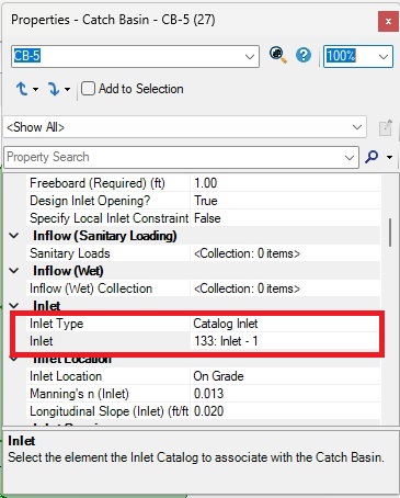 The Inlet Catalog is available through the Ribbon search or Components > Catalogs > Inlet Catalog. When you choose the inlet type the input parameters will be available. Once you have the data entered, you will be able to choose the catalog inlet in the catch basin properties.