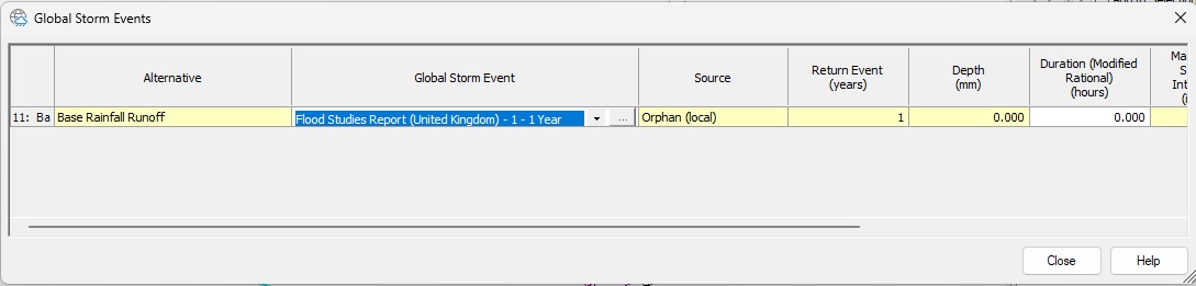 Whatever storm data type is used, once the storm data is inputted, the storm is assigned to an Rainfall Runoff alternative using Global Storm Events (Home > Storm Data > Global Storm Events or Components > Storm Data > Global Storm Events).