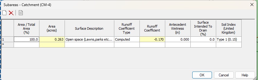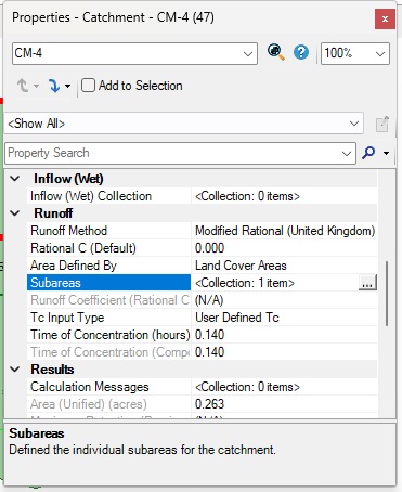 With the Modified Rational (UK) Method, you will define the time of concentration the type of area (Single Area, Multiple Subareas, and Land Use Area). With Multiple Subareas and Land Use Area, you will have a collection field with input for the area.