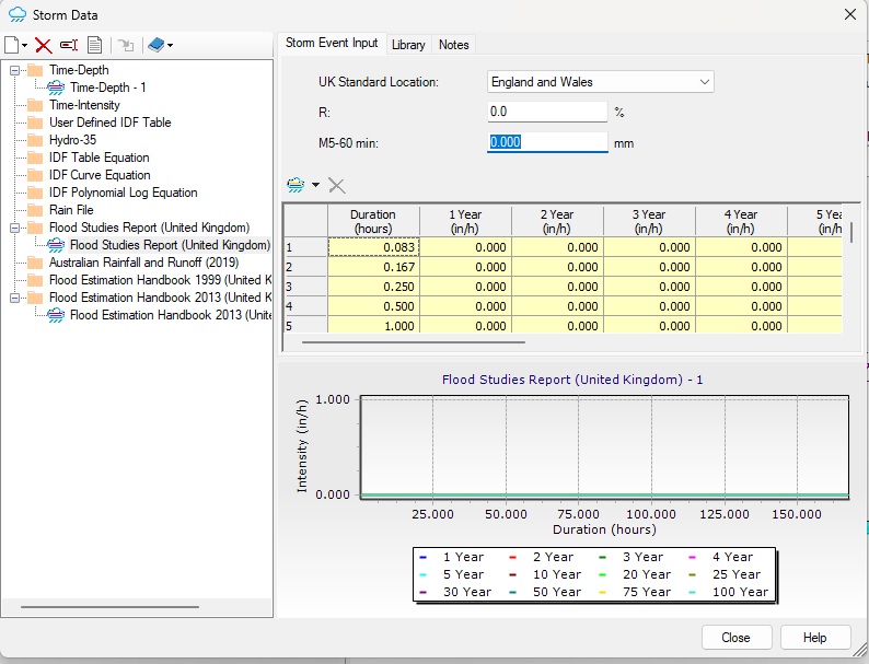 To use this method, create a new entry for the Flood Estimation Handbook storm type. You will then be able to import an XML file that is available from the UK Centre of Ecology & Hydrology through their FEH Web Service. After importing this, the depth is calculated from the file details, and then converted to intensity-based rainfall series.