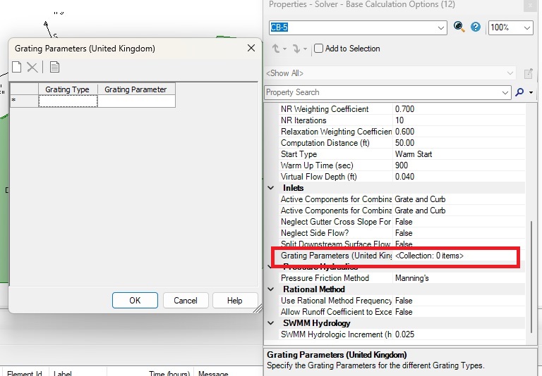 If you use the Grating inlet type, there are additional parameters that need to be entered in the calculation options. In the Inlets section of the calculation options, click in the Grating Parameters cell to enter the Grating Type and Grating Parameter.