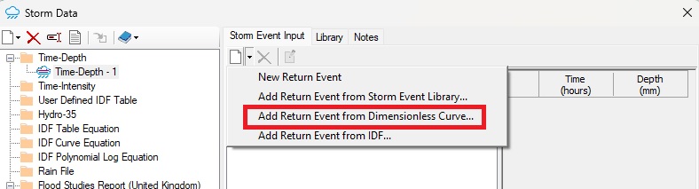 Using Time-Depth or Time-Intensity storm types, you can import the UK Storm Profiles dimensionless rainfall curve. After creating a new Time-Depth or Time-Intensity storm, click the “Add Return Events” button and choose “Add Return Event from Dimensionless Curve”.