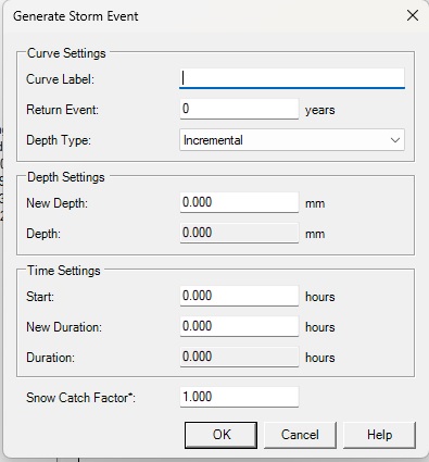 After selecting the curve, you will enter the return event, depth type (Incremental or Cumulative), depth and duration. After clicking OK, a new curve will be available based on the input.