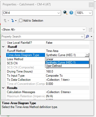 With Time-Area runoff method, you will define the Time-Area Diagram Type (User-Defined, Linear, and Synthetic Curve (HEC-1). The input parameters in the properties will change based on the input.