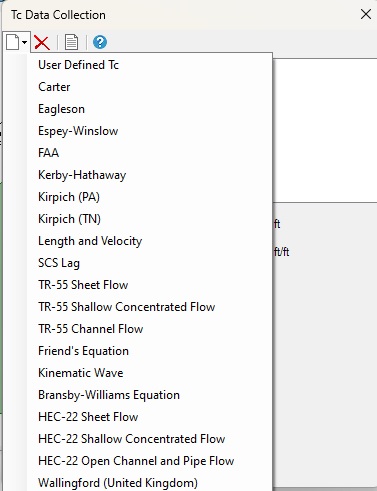 Time of Concentration can be added as a user-defined value, but if you select Composite Tc for the “Tc Input Type” field in the catchment properties you can select from a number of calculation methods for time of concentration, including Wallingford (UK).