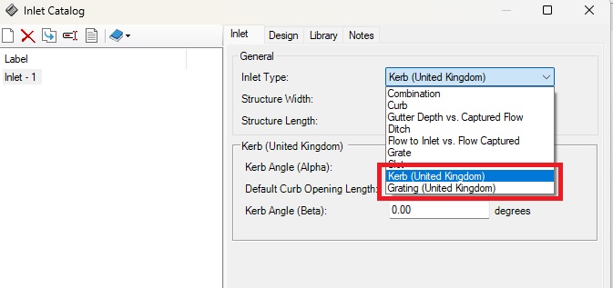 There are two UK-specific inlet types in the Inlet Catalog: Kerb and Grating.