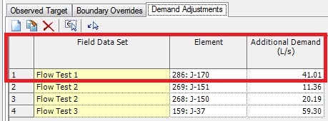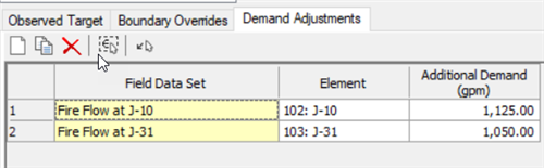 Demand Adjustments is the last tab. This is used to adjust demand for individual elements, such as flow from a hydrant or a junction that occurs only during the time that the field measurements were observed. Enter data here as necessary. Note that the "simulated flow" results at the end of the calibrator run do not list demand adjustments - you can assume that the demand adjustment values that you enter will always be applied during the timestep specified in the field data snapshot during calibration (assuming that you have chosen to use the snapshot in question in a Calibration run).